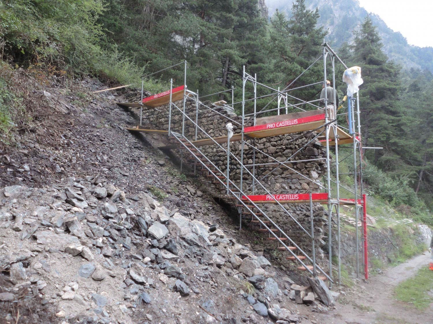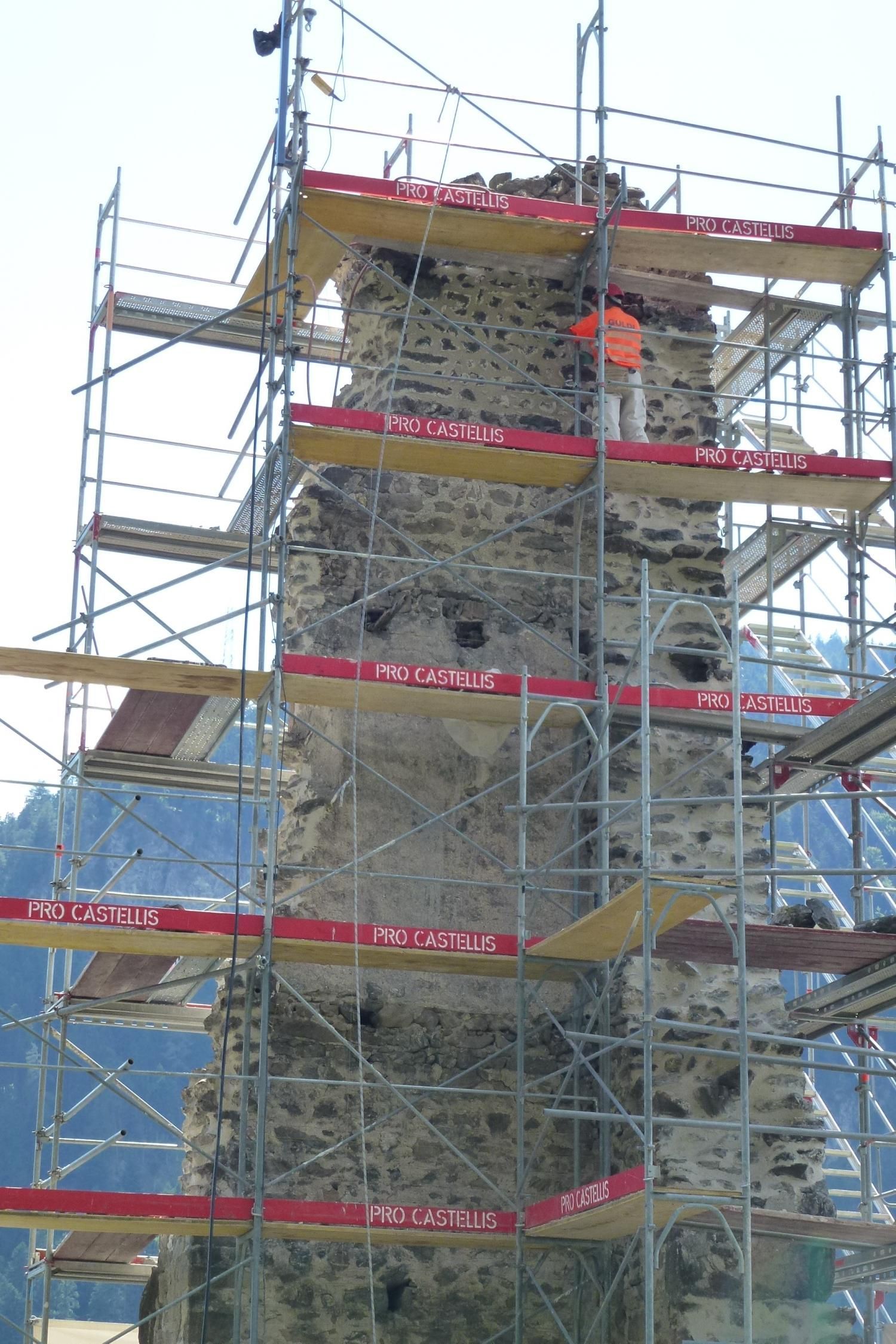 PRO CASTELLIS verfügt über das Bauinventar eines kleineren Baugeschäftes mit Gerüsten, Baucontainern, Baugerät und Fahrzeugen. Bei der Unterstützung von Burgensicherungen zu Gunsten von Gemeinden wird dieses Inventar im Rahmen der Beitragsgewährung ohne Berechnung eingesetzt. Hier Gerüste von P.C. am Churer Tor der PORTA RHAETICA und am Turnzahn von Juvalt hoch über Rothenbrunnen.