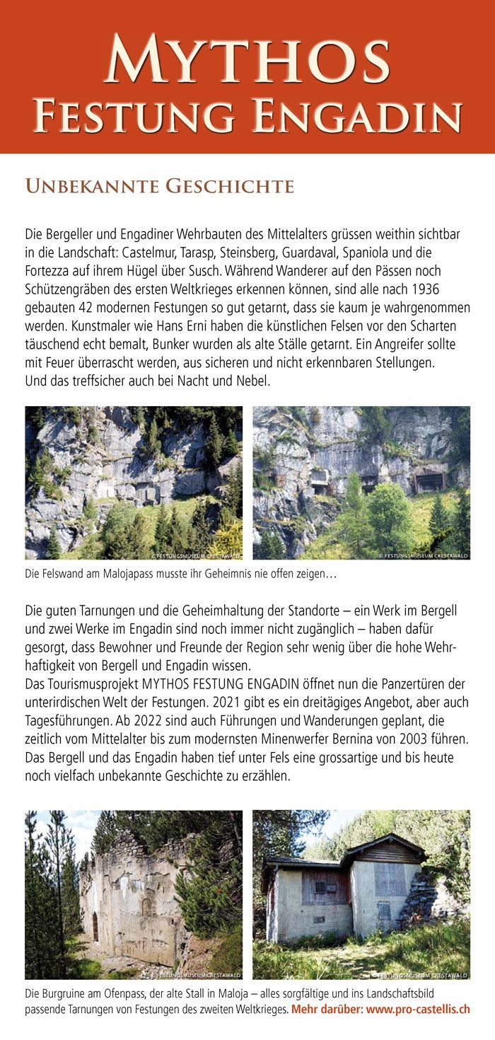 Die guten Tarnungen und die Geheimhaltung der Standorte – ein Werk im Bergell und zwei Werke im Engadin sind noch nicht zugänglich – haben dafür gesorgt, dass Bewohner und Freunde der Region sehr wenig über die hohe Wehrhaftigkeit von Bergell und Engadin wissen. Das neueTourismusprojekt MYTHOS FESTUNG ENGADIN öffnet nun die Panzertüren der unterirdischen Welt der Festungen. 2020 war die erste Festungswoche in Maloja und Albula ausgebucht, 2021 kommen die Festungen von Ova Spin und Lavin dazu mit Anlagen des ersten Weltkrieges, des zweiten Weltkrieges und des Kalten Krieges. Ab 2022 werden auch die Festungen von Bernina, Flüela und Susch und die drei modernen Artilleriebunker des Engadins besucht. Es sind auch Mehrtageswanderungen und ein Biketrail geplant, die zeitlich vom Mittelalter bis in die Gegenwart führen. Das Bergell und das Engadin haben tief unter Fels eine grossartige und bis heute noch vielfach unbekannte Geschichte zu erzählen.
