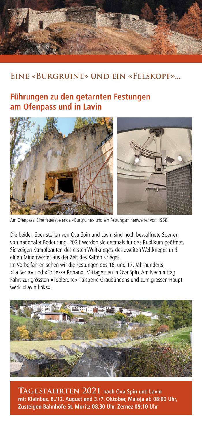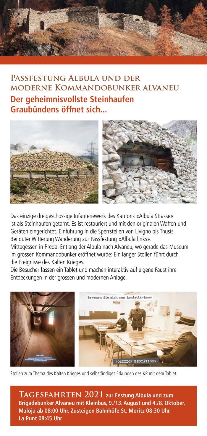Für die dreitägigen Exkursionen werden erstmals die lange geheimen Festungs-anlagen von Maloja, Ova Spin am Ofenpass, in Lavin und auf dem Albulapass geöffnet . Dazu besuchen wir das neu eröffnete Museum im Brigade-Kommando-bunker in Alvaneu. Eine Bildergalerie führt uns dort durch die Ereignisse des Kalten Krieges. Dann fassen die Teilnehmer Tablets und erkunden damit selbst die grosse und moderne Anlage. Referate begleiten diese Reise in die ferne Zeit einer wehrhaften Schweiz.