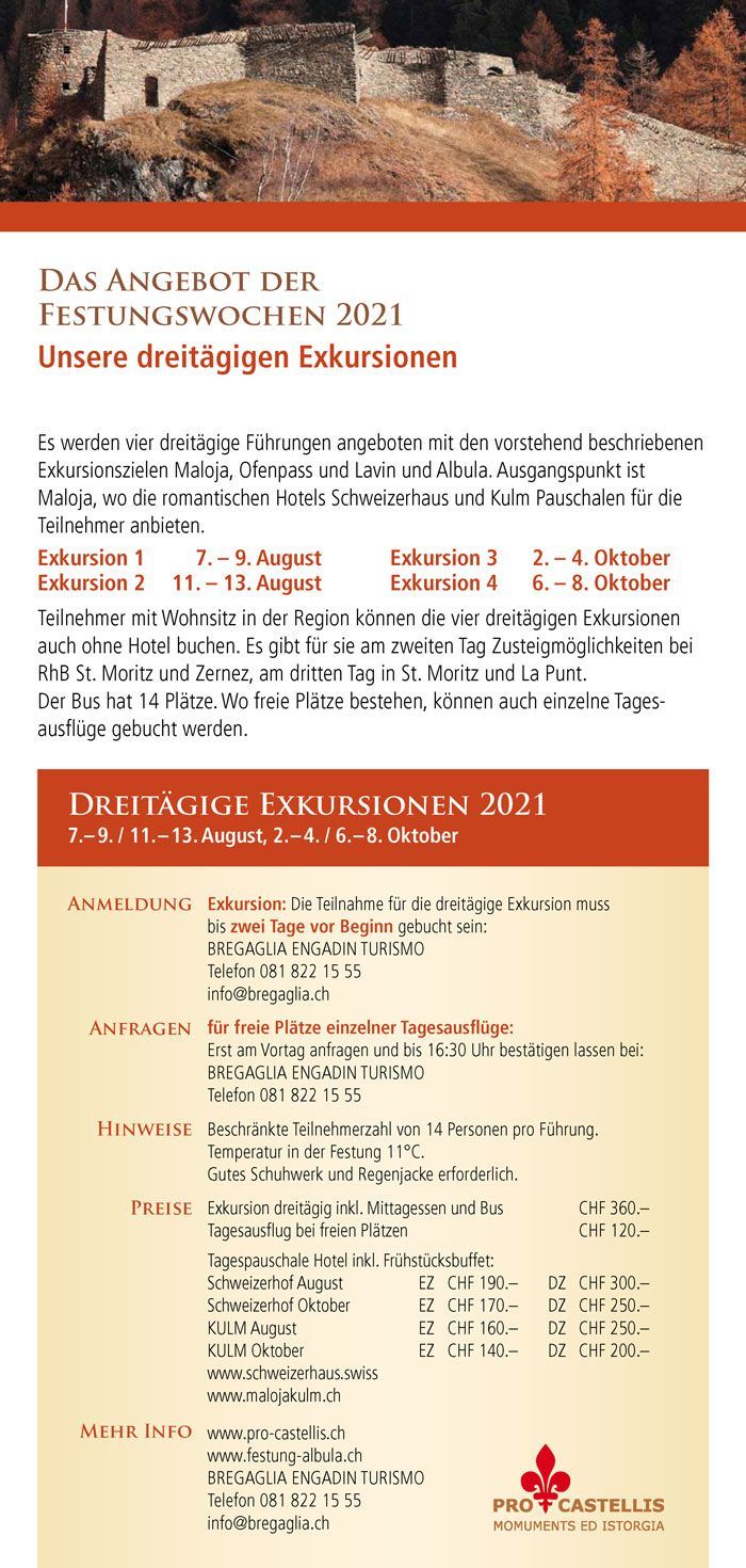 Die Festungswochen 2021 im Bergell und im Engadin bestehen aus vier gleichartigen dreitägigen Exkursionen: